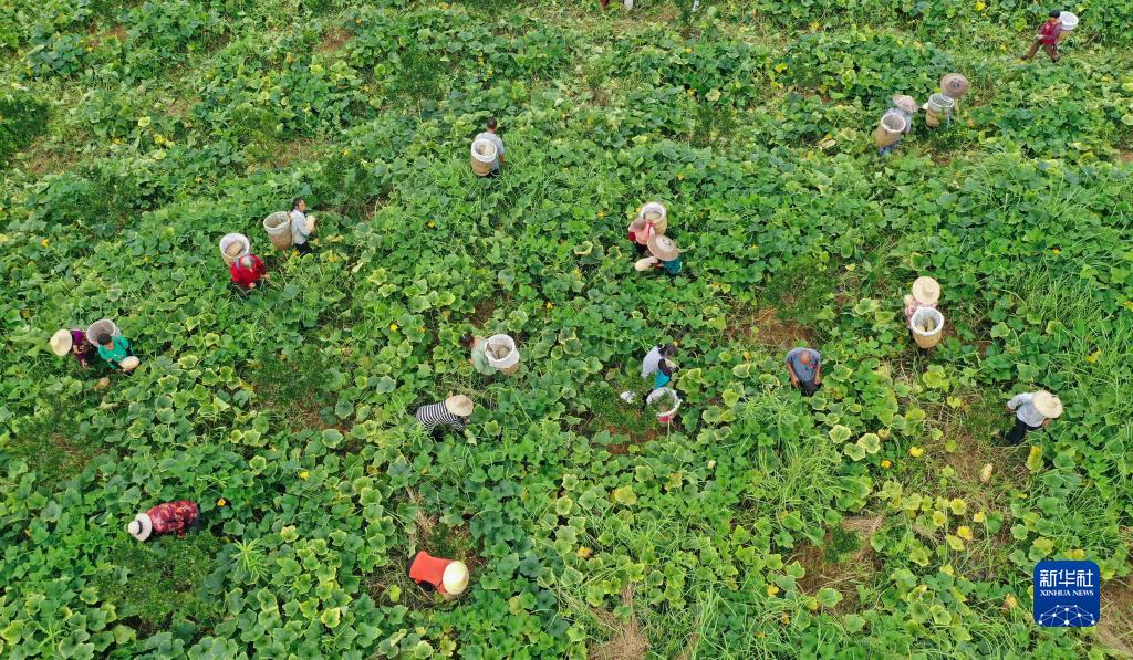 7月29日,农民在贵州省铜仁市松桃苗族自治县大路镇和平村采收南瓜(无人机照片)。