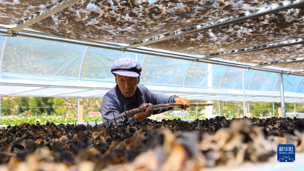 7月29日,在卓尼县纳浪镇纳浪村黑木耳种植基地,农户在翻晒黑木耳。