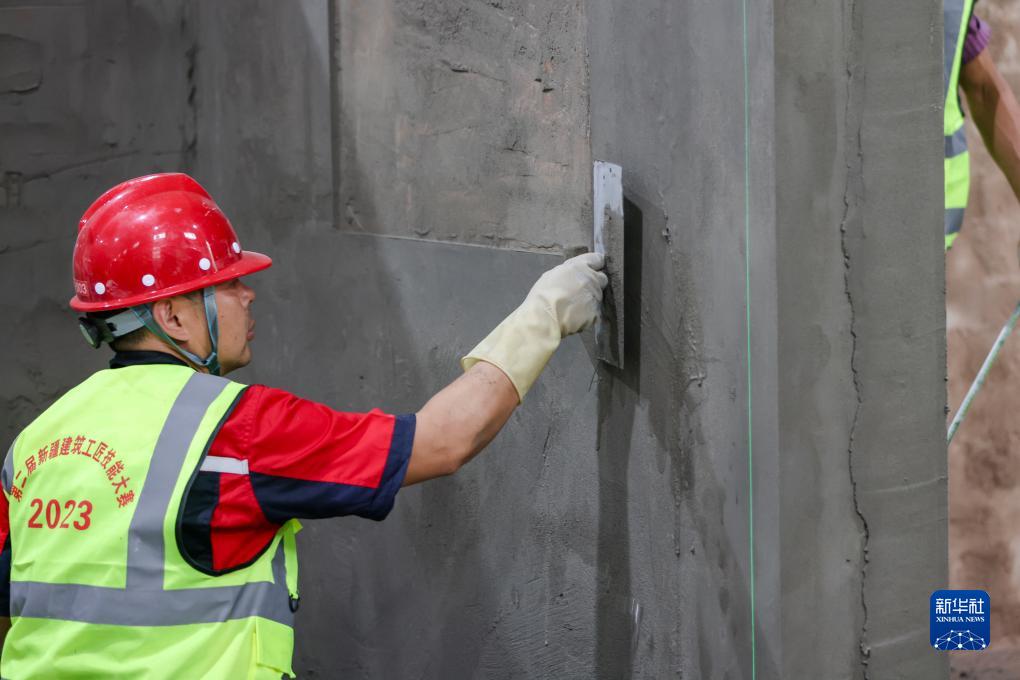 7月29日,在第二届新疆建筑工匠技能大赛决赛现场,参赛选手在进行抹灰工项目竞赛。
