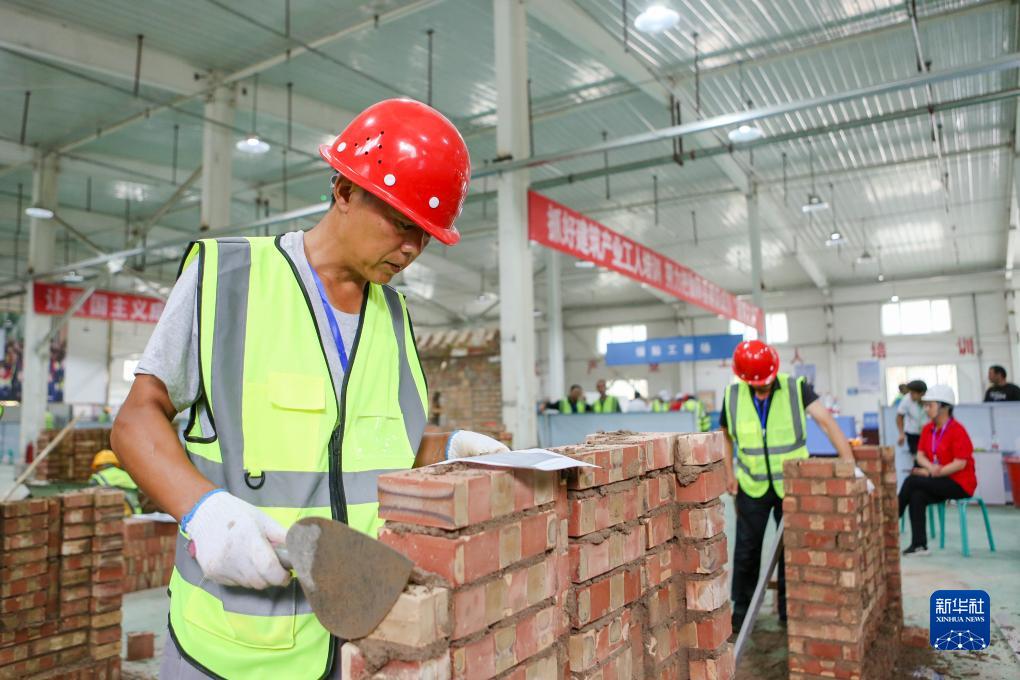 7月29日,在第二届新疆建筑工匠技能大赛决赛现场,参赛选手在进行砌筑工项目竞赛。