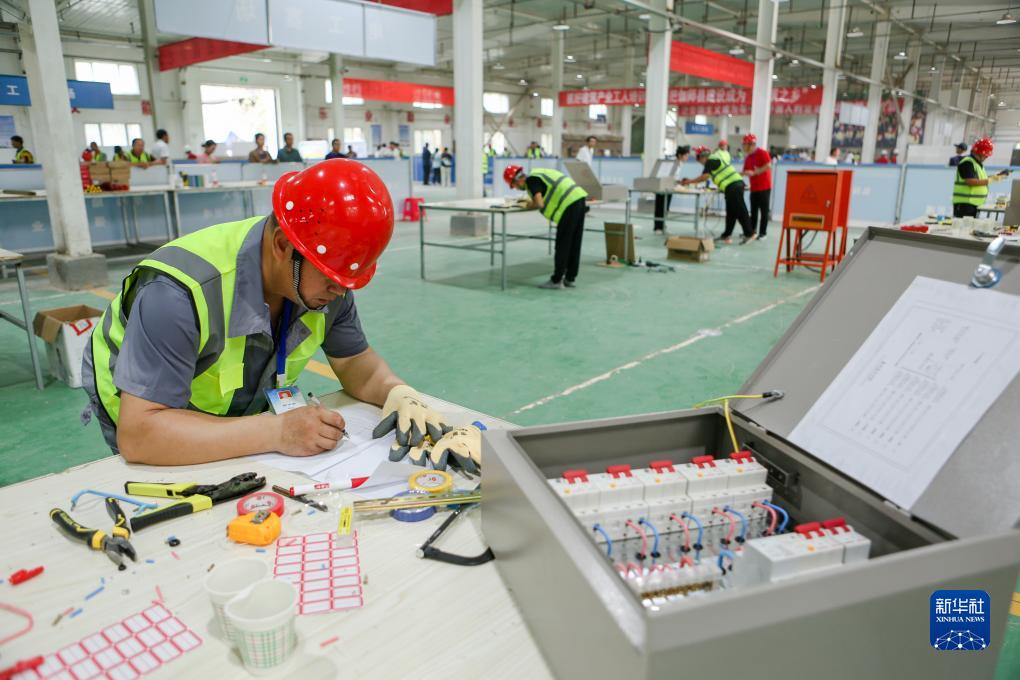 7月29日,在第二届新疆建筑工匠技能大赛决赛现场,参赛选手在进行电工项目竞赛。