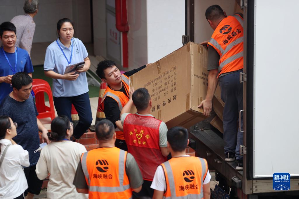 7月29日,在福建省厦门市新圩学校临时安置点,志愿者在搬运物资。