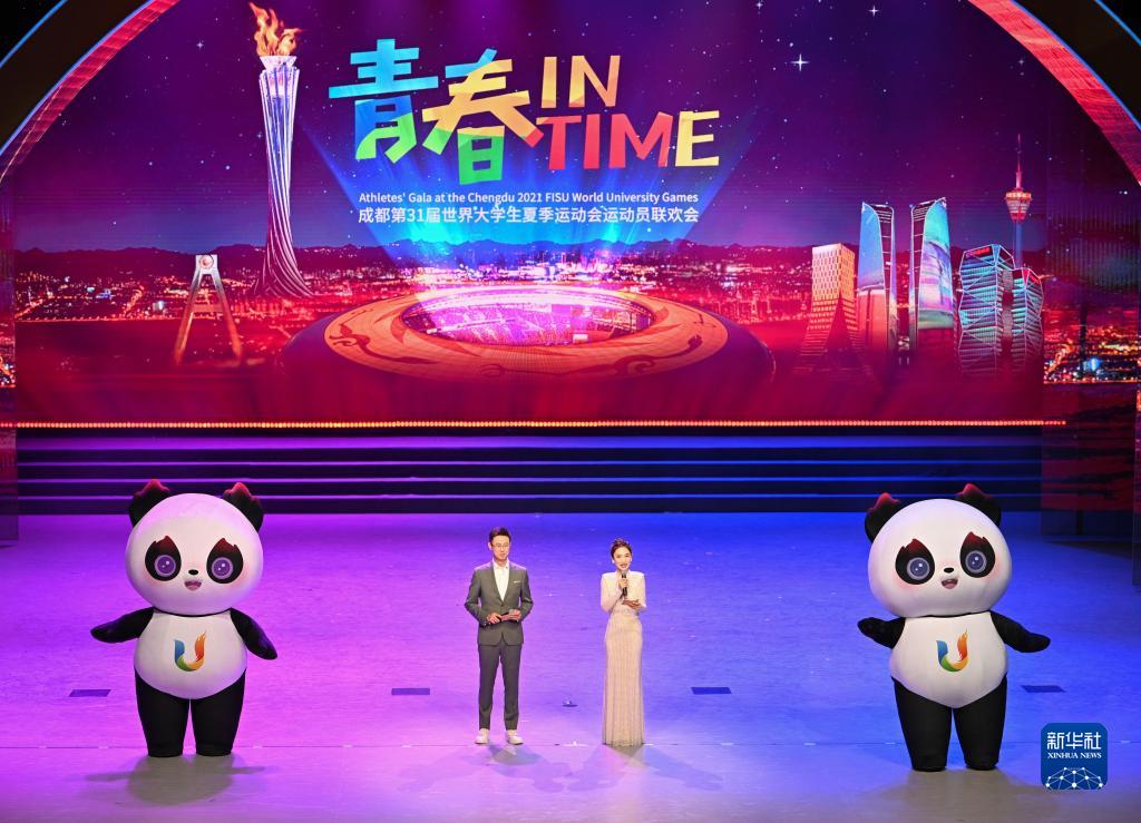 当晚,“青春 In Time”第31届世界大学生夏季运动会运动员联欢会在成都大运村艺术中心大剧场举办。联欢会以魔术、舞蹈、演唱等艺术形式为桥梁,推动中外青年艺术家、运动员、大学生及志愿者代表互动交流,营造欢乐、友爱的大运氛围。新华社记者 蔡湘鑫 摄