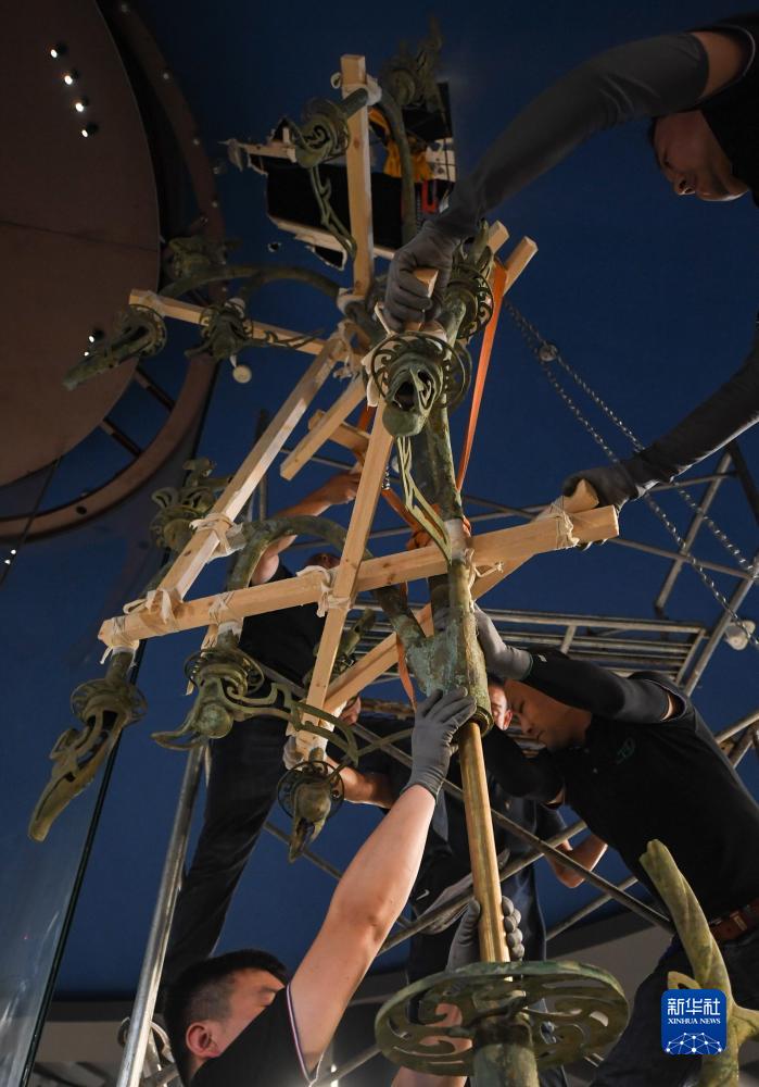 在三星堆博物馆老馆,工作人员准备将Ⅰ号大型铜神树上下部分分离(7月16日摄)。