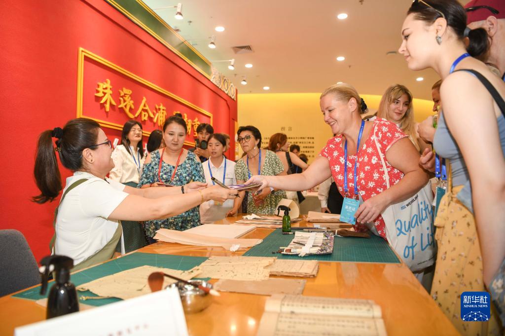 新疆古籍修复师米娜瓦尔·阿不都热合曼(左一)向俄罗斯萨拉托夫州曙光歌舞团演员赠送桑皮纸(7月23日摄)。
