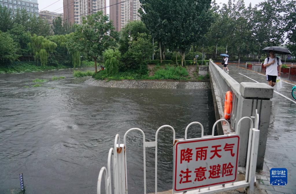 7月30日,在北京市凉水河周边,市民冒雨出行。