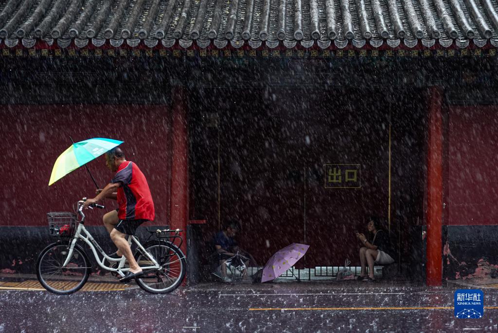 7月30日,市民在北京雍和宫大街冒雨骑行。