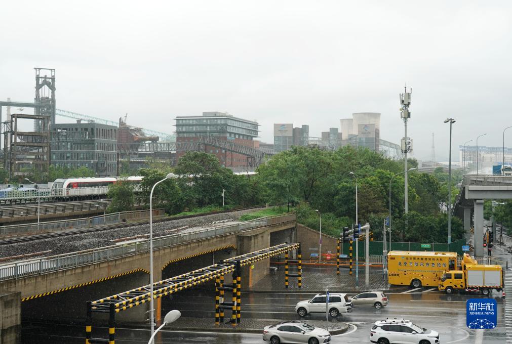 7月30日,在北京市石景山区金安桥附近,工作人员在值守应对可能形成的城市低洼地区积水。