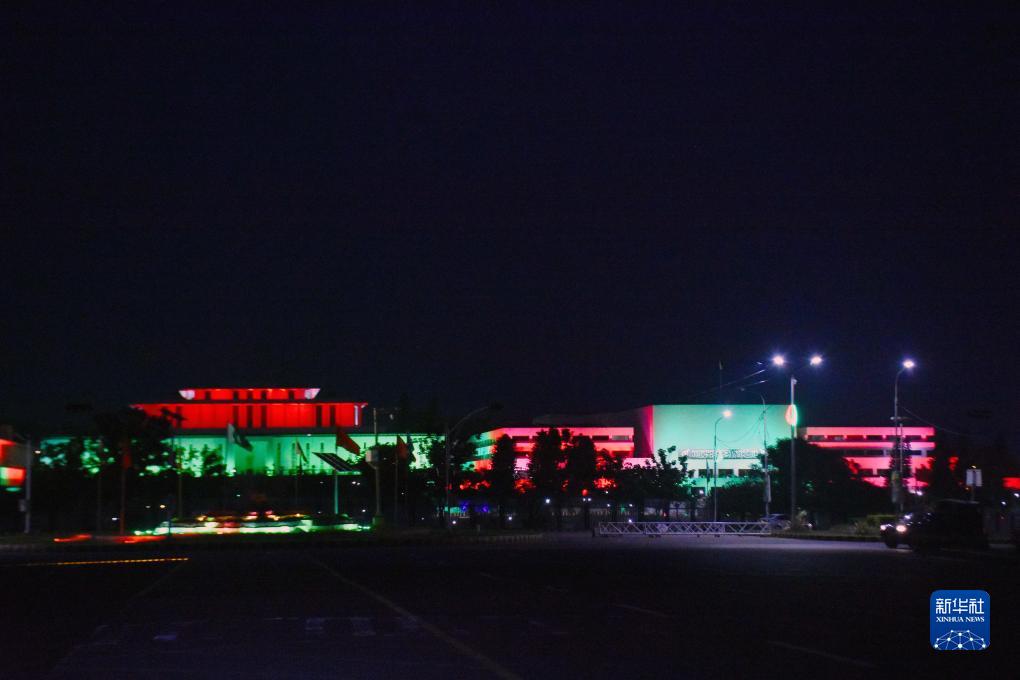 近日,巴基斯坦首都伊斯兰堡地标建筑亮起中巴两国国旗颜色灯光,庆祝中巴经济走廊启动十周年。