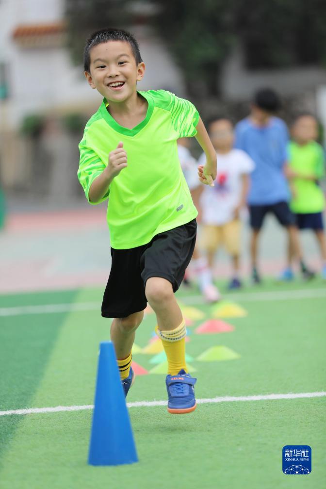 7月30日,在湖南省永州市道县树湘学校足球场,小朋友进行身体灵敏度训练。
