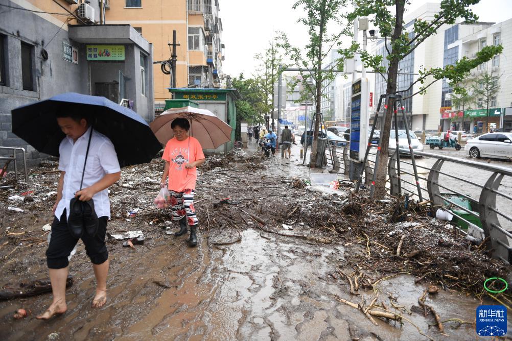 7月31日,在北京市门头沟区双峪路,行人从淤泥和杂物上走过。