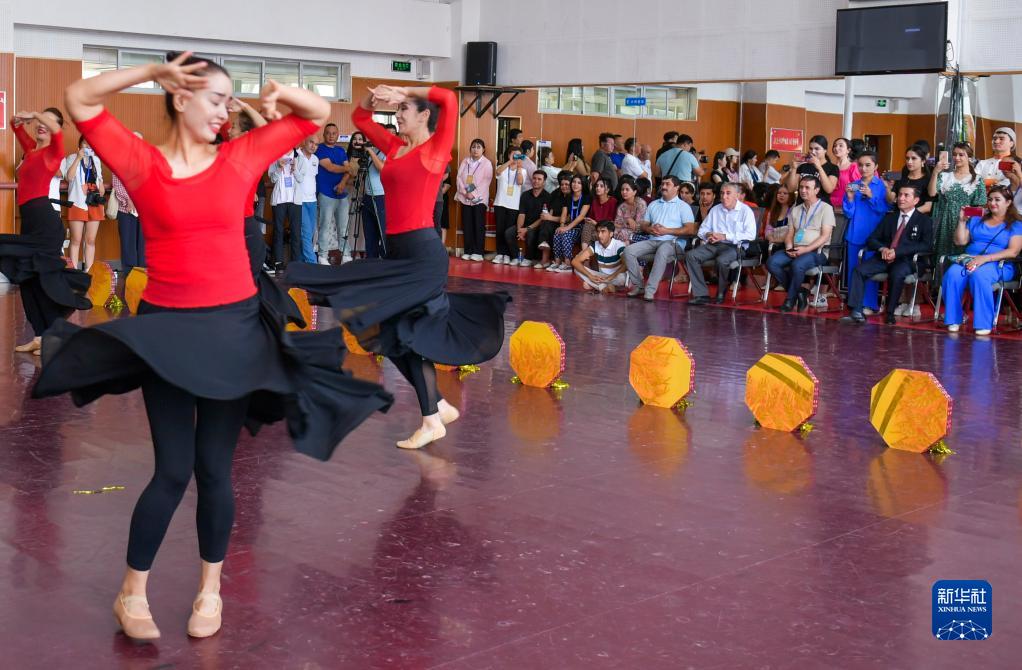 当日,在乌鲁木齐参加第六届中国新疆国际民族舞蹈节的塔吉克斯坦罗拉国家功勋歌舞团走进新疆艺术剧院,双方演员在音乐、舞蹈等方面进行交流,展示绚丽多姿的风采。