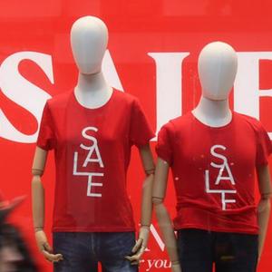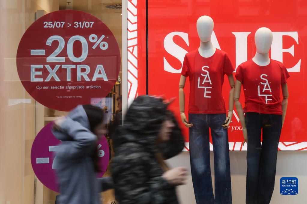 7月31日,在比利时安特卫普,人们从商业街上的促销广告前走过。