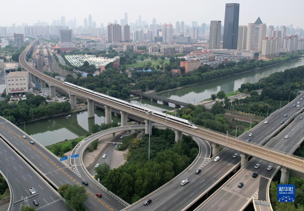 京津城际列车从天津城区穿行(7月20日摄,无人机照片)。