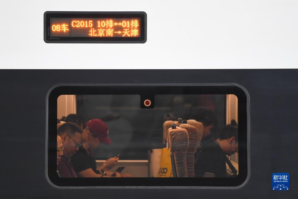 8月1日,在北京南站,旅客乘坐京津城际列车出行。