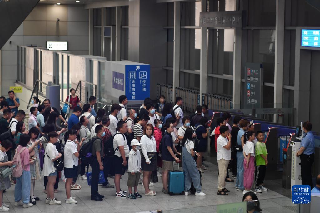 8月1日,旅客在北京南站排队候车,准备乘坐京津城际列车出行。