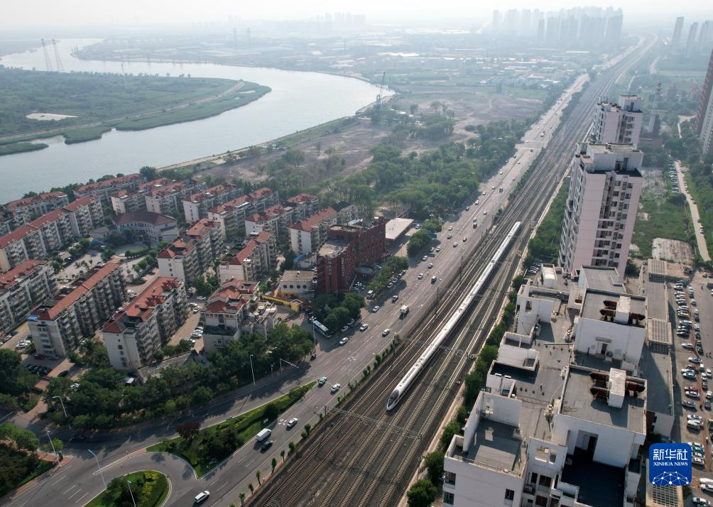 京津城际列车从塘沽站驶出(7月19日摄,无人机照片)。