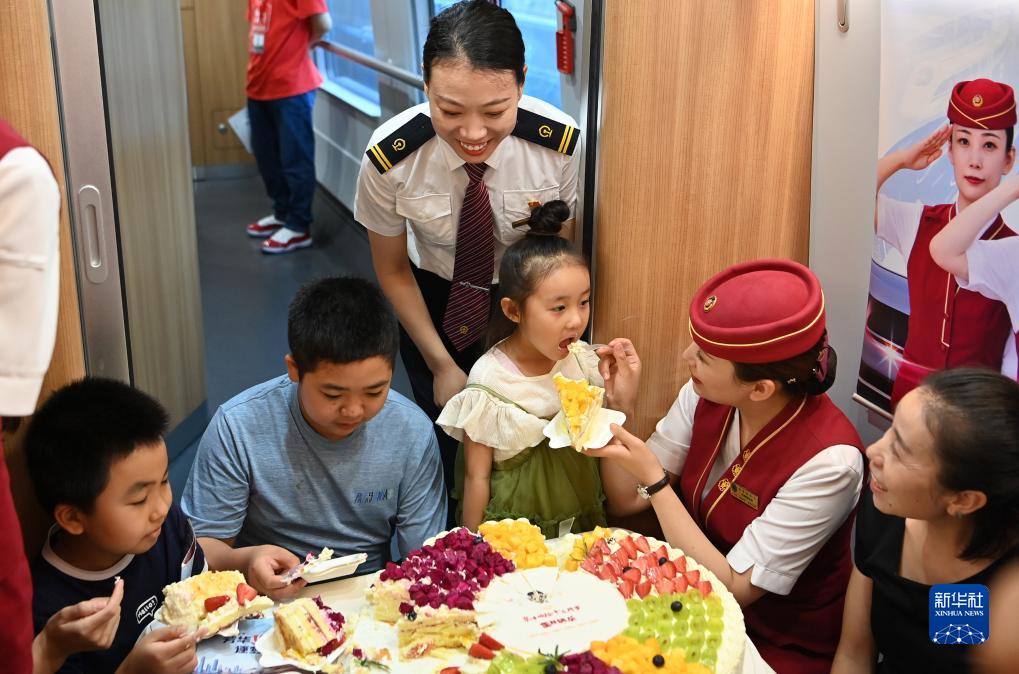 8月1日,天津客运段的乘务人员在京津城际列车上给小朋友喂蛋糕。