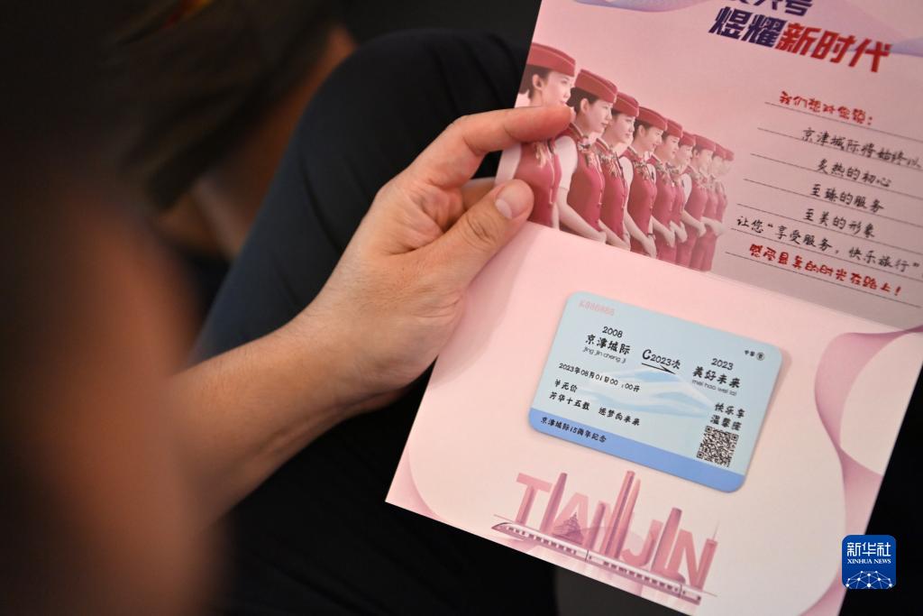8月1日,乘坐京津城际列车的旅客在查看纪念册。