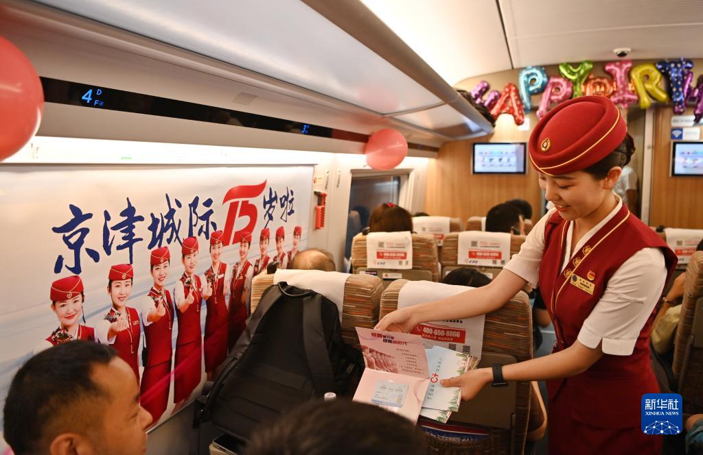 8月1日,天津客运段的乘务人员在京津城际列车上给旅客发放纪念册。