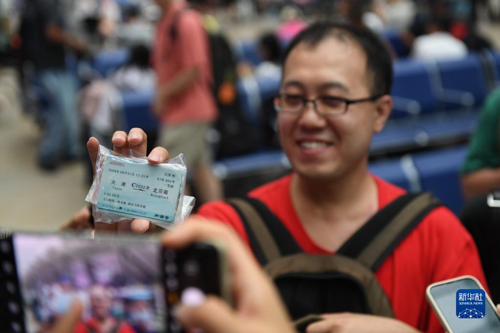 8月1日,一名旅客向记者展示2008年8月1日京津城际铁路开通运营时所购买的火车票。