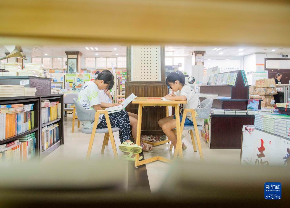8月1日,几名学生在湖南省永州市道县新华书店阅读。