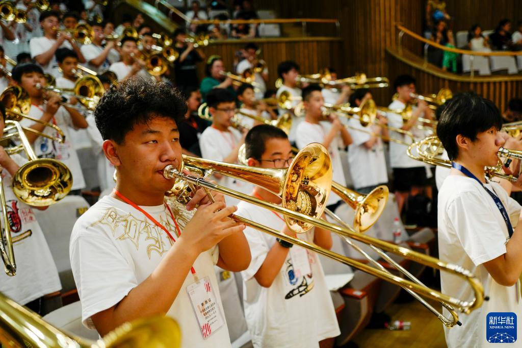 8月1日,在第九届中国国际低音铜管艺术节的一场公益大师课上,低音铜管乐器爱好者在练习长号。