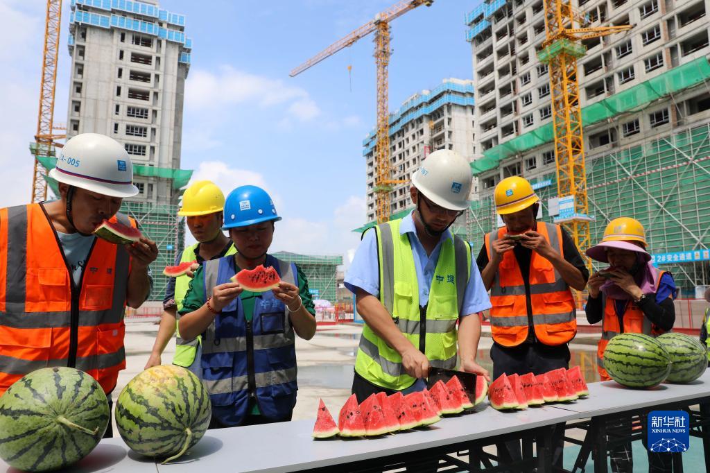 8月1日,中建二局合肥林店家园安置房项目部的工友在工地休息区吃西瓜解暑。