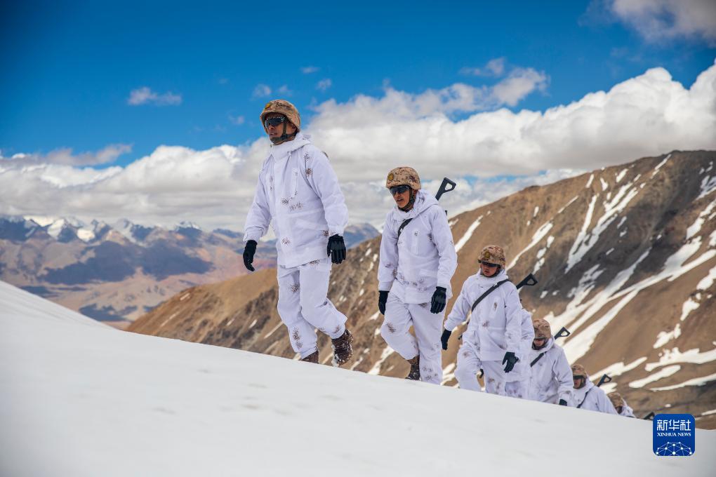 驻守在“生命禁区”的陆军某边防团官兵踏雪向点位前行(7月31日摄)。