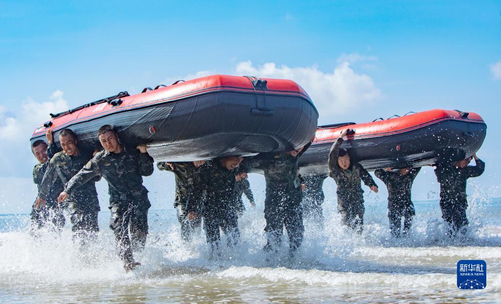 武警广西总队防城港支队官兵组织扛舟行进训练(7月31日摄)。