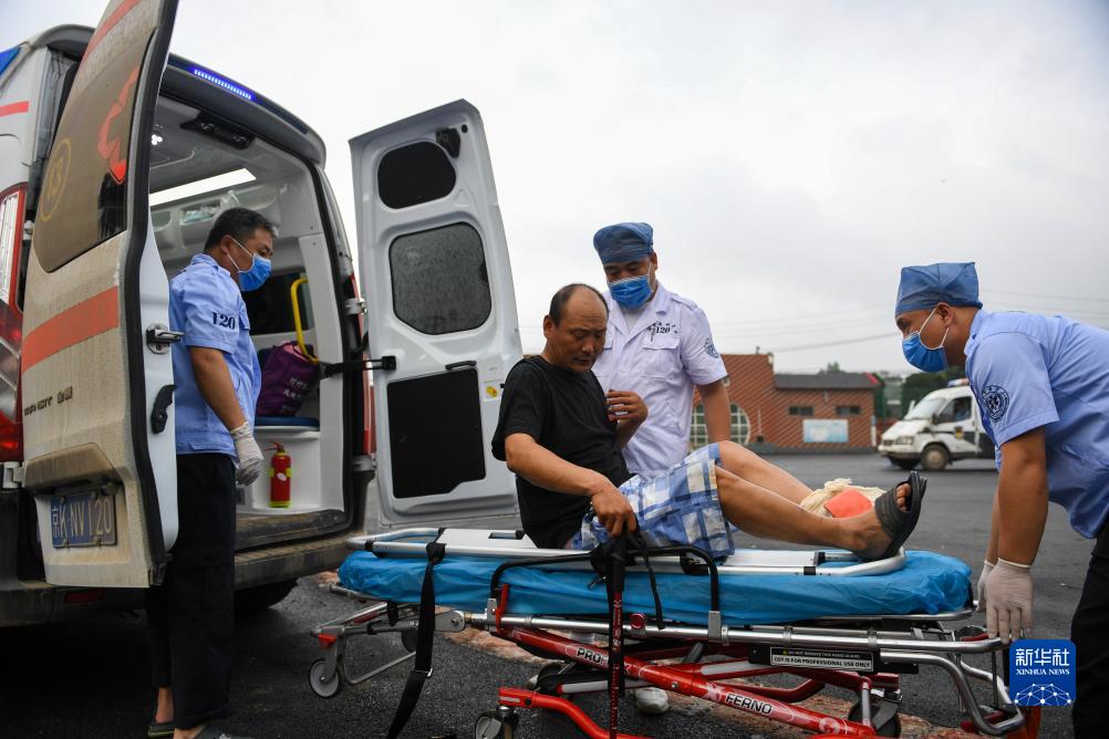8月1日,在北京市门头沟区妙峰山镇妙峰山民族学校临时安置点,北京急救中心工作人员在转运一名受伤村民。