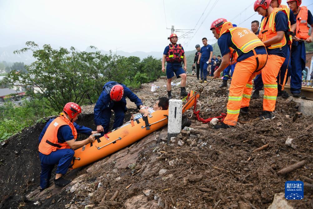8月1日,在北京市门头沟区水峪嘴村,北京门头沟区消防救援支队的消防员在转运一名受伤村民。