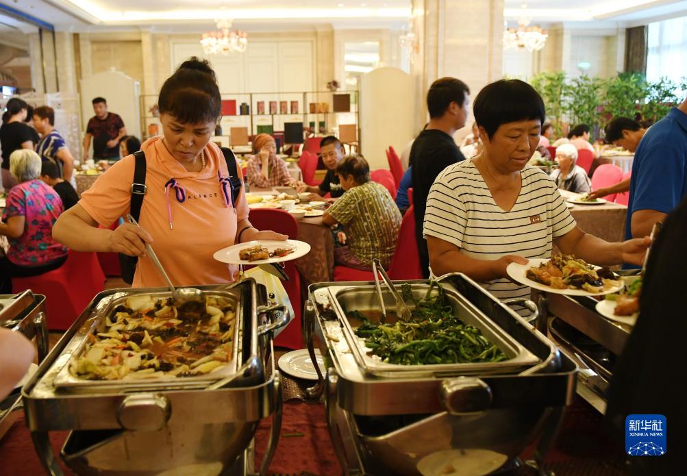 8月1日,北京市房山区青龙湖镇的村民在临时安置点用餐。