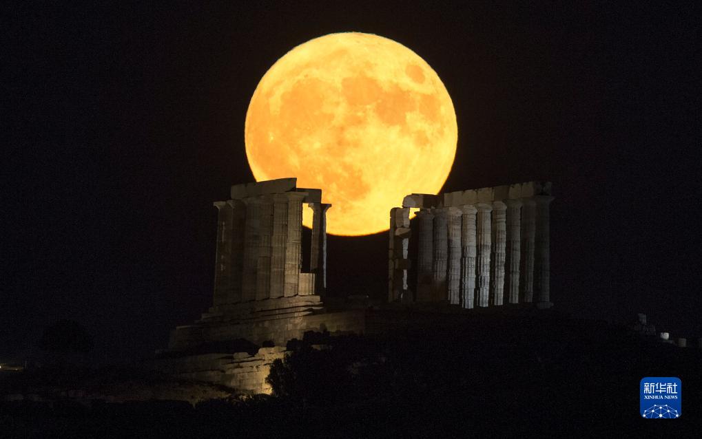 8月1日晚,一轮满月在希腊雅典附近苏尼翁角的波塞冬海神庙上空升起。