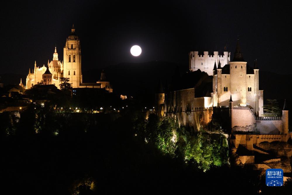 这是8月1日晚在西班牙塞哥维亚拍摄的“超级月亮”和塞哥维亚主教座堂(左)及塞哥维亚城堡。