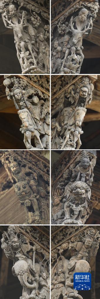 诸葛村丞相祠堂雕刻精湛的“牛腿”(拼版照片,8月1日摄)。