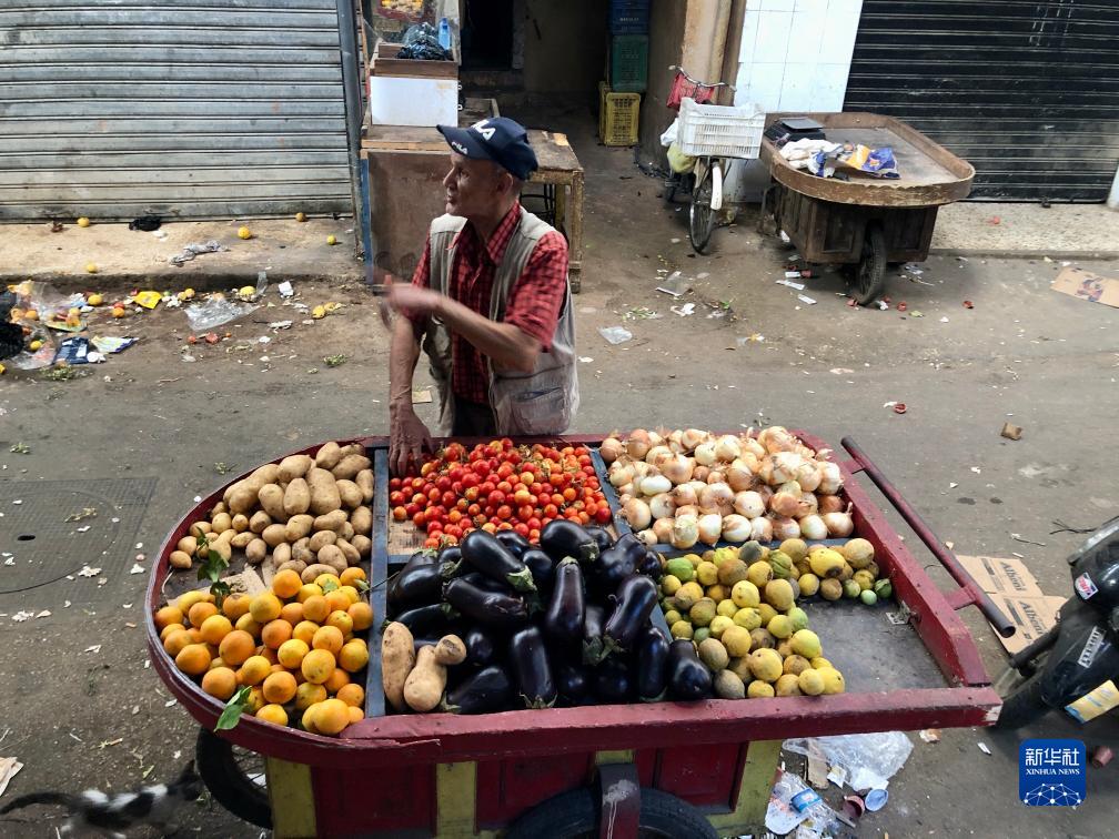 8月1日,在黎巴嫩南部西顿市附近的艾因·哈勒瓦难民营,一名男子在街上卖菜。