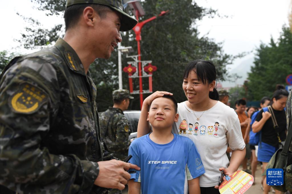 来自内蒙古的三年级小学生武天骐跟随家人乘坐K396次列车来北京,受强降雨影响被困。8月2日上午,他跟随家人在武警北京总队机动三支队官兵的护送下,从落坡岭村徒步转移至妙峰山镇政府,短暂休整后将继续转移至丰台火车站。