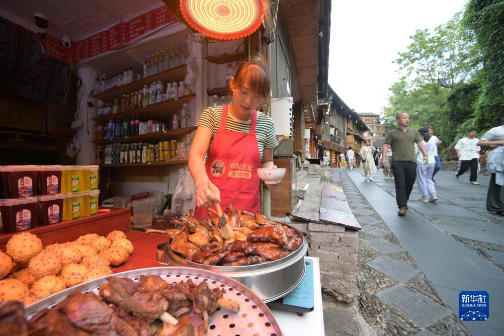 8月1日,一名店主在贵州省黔东南苗族侗族自治州雷山县西江千户苗寨景区准备食品。