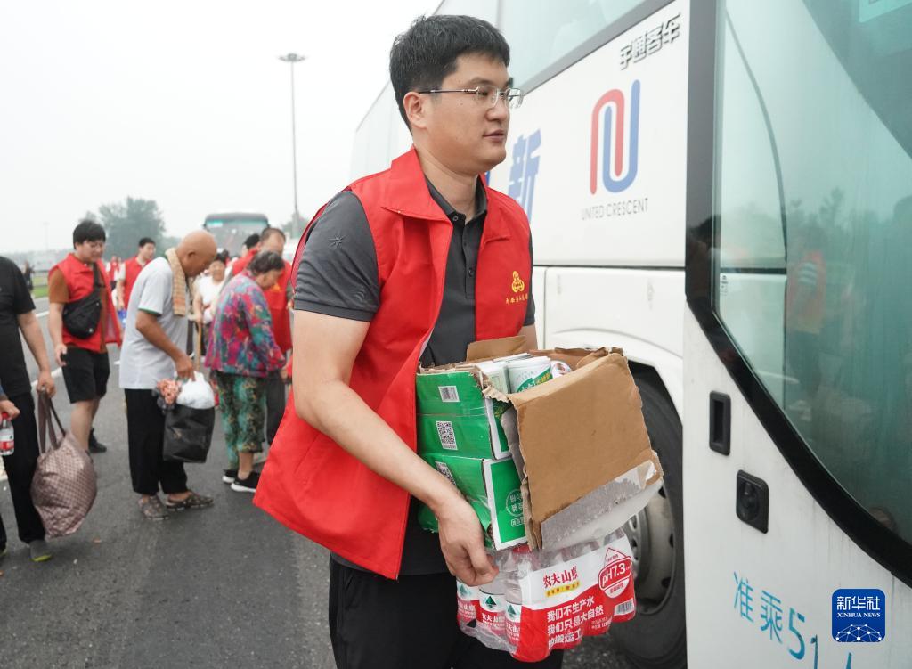 8月2日,在北京市房山区的京港澳高速琉璃河出口,志愿者为受灾群众搬运食品和饮用水。