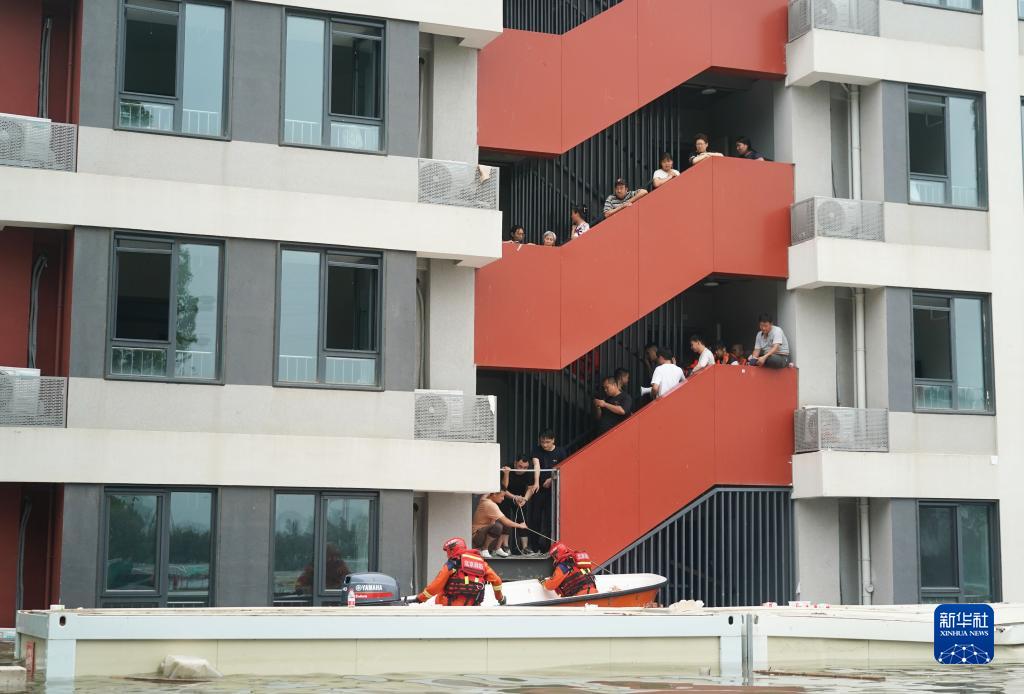 8月2日,在北京市房山区琉璃河镇平各庄村,消防员驾驶冲锋舟转移受灾群众。
