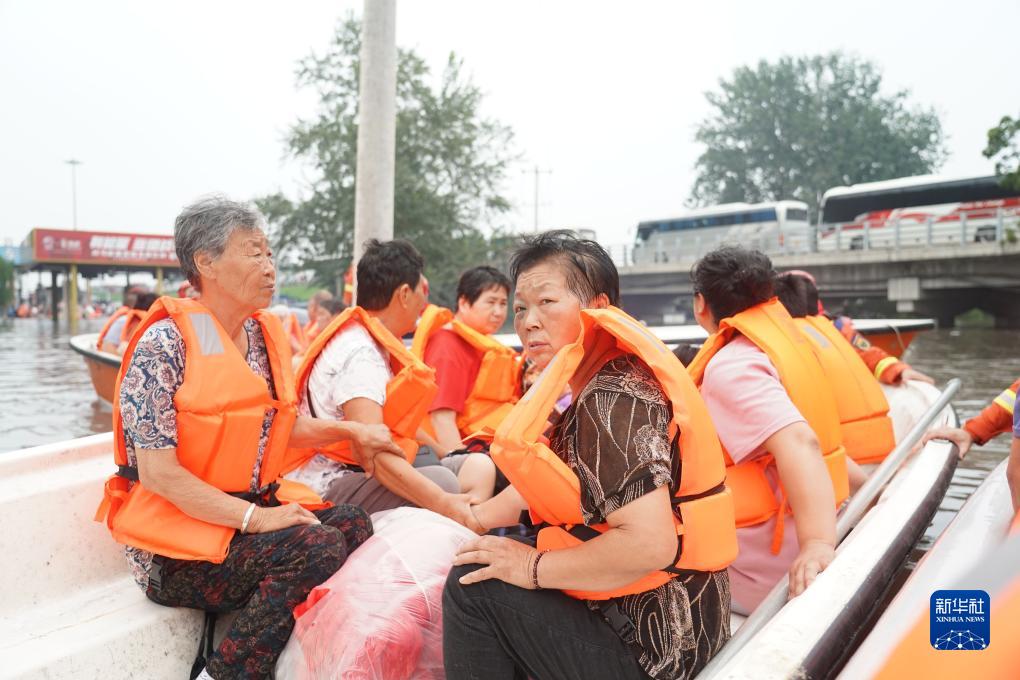 近日,受持续强降雨影响,北京市房山区部分区域发生山洪灾害。8月2日,由消防员、医护人员、志愿者等组成的救援力量有序转运琉璃河镇平各庄村的受灾群众。