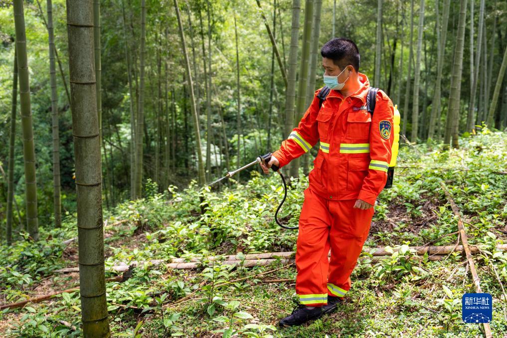 8月2日,在桃江县桃花江国有林场,护林员喷洒治理竹蝗的药水。