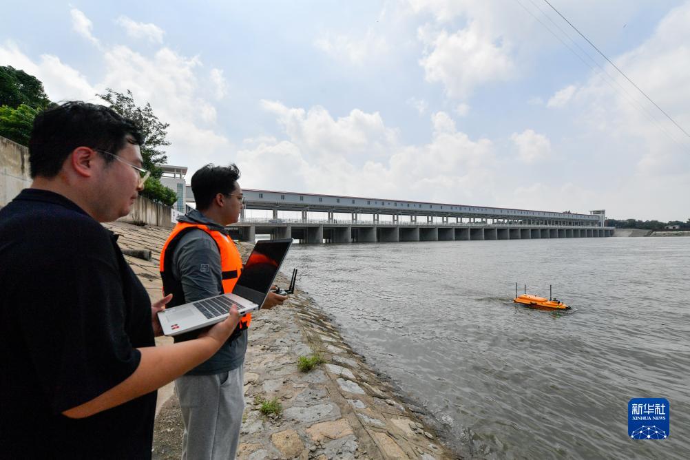 8月2日,在天津市独流减河进洪闸上游,水文人员操作无人水文监测船进行水文监测。