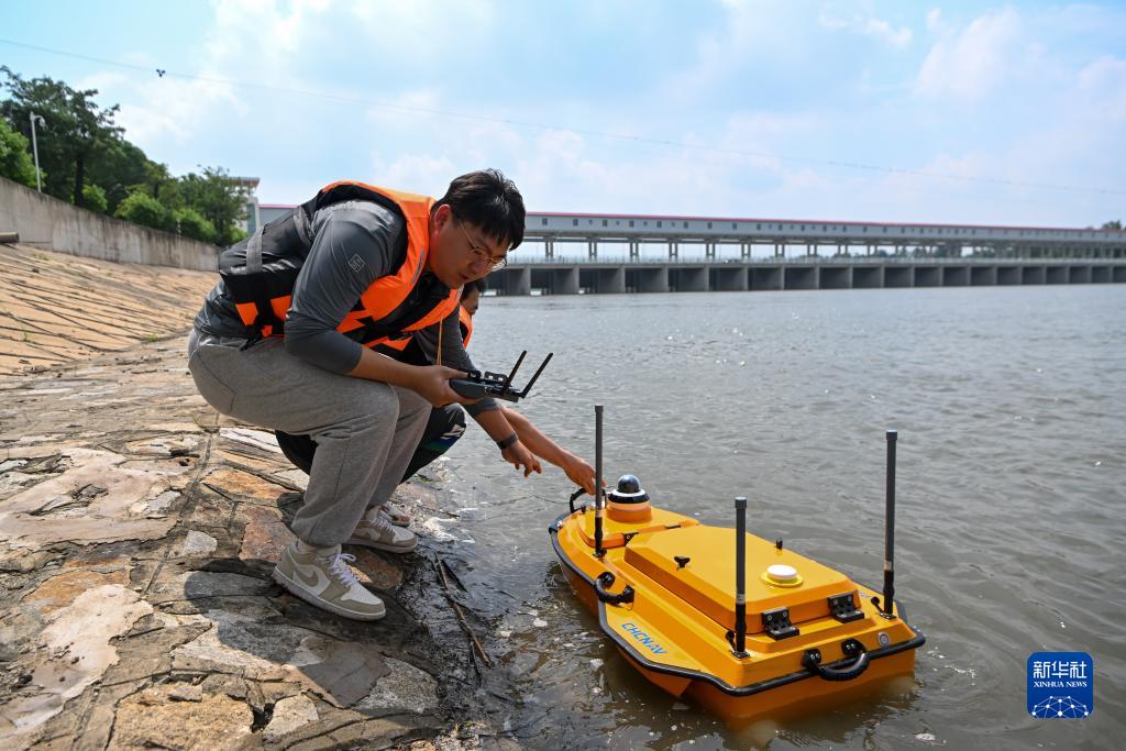 8月2日,在天津市独流减河进洪闸上游,水文人员在岸边准备使用无人水文监测船进行水文监测。