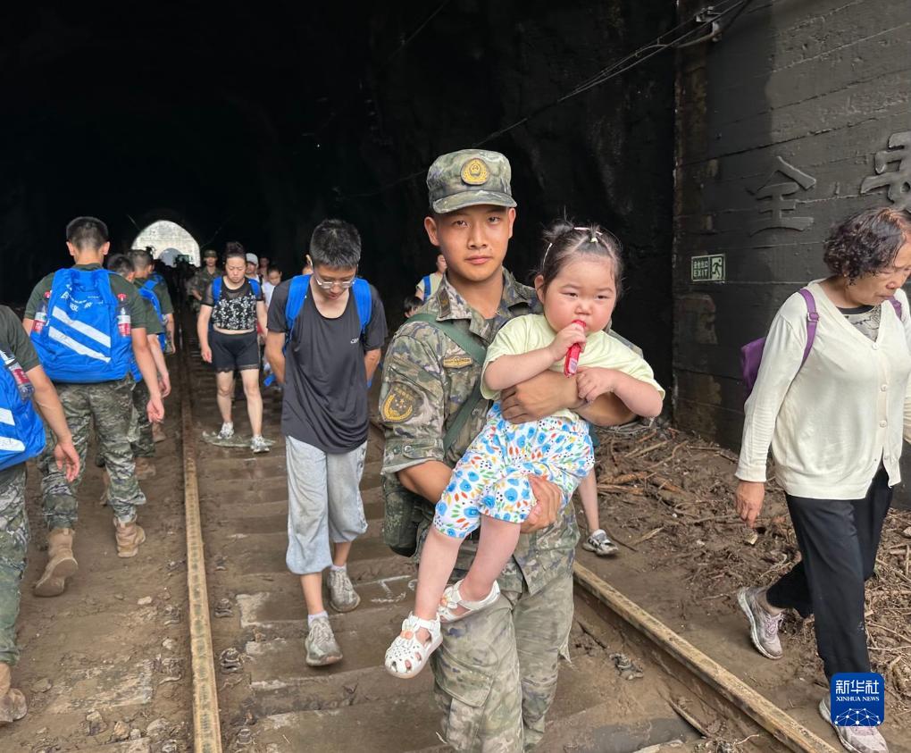 8月2日,受困列车的旅客在武警北京总队机动第三支队官兵的帮助下徒步前往转运客车(手机照片)。