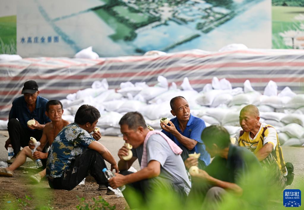 8月3日,抗洪人员在天津市西青区辛口镇子牙河岸边吃饭休息。