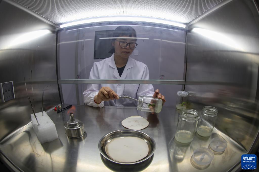 刘利平博士在高原核桃研究所用核桃组织培养标本做实验(7月27日摄)。