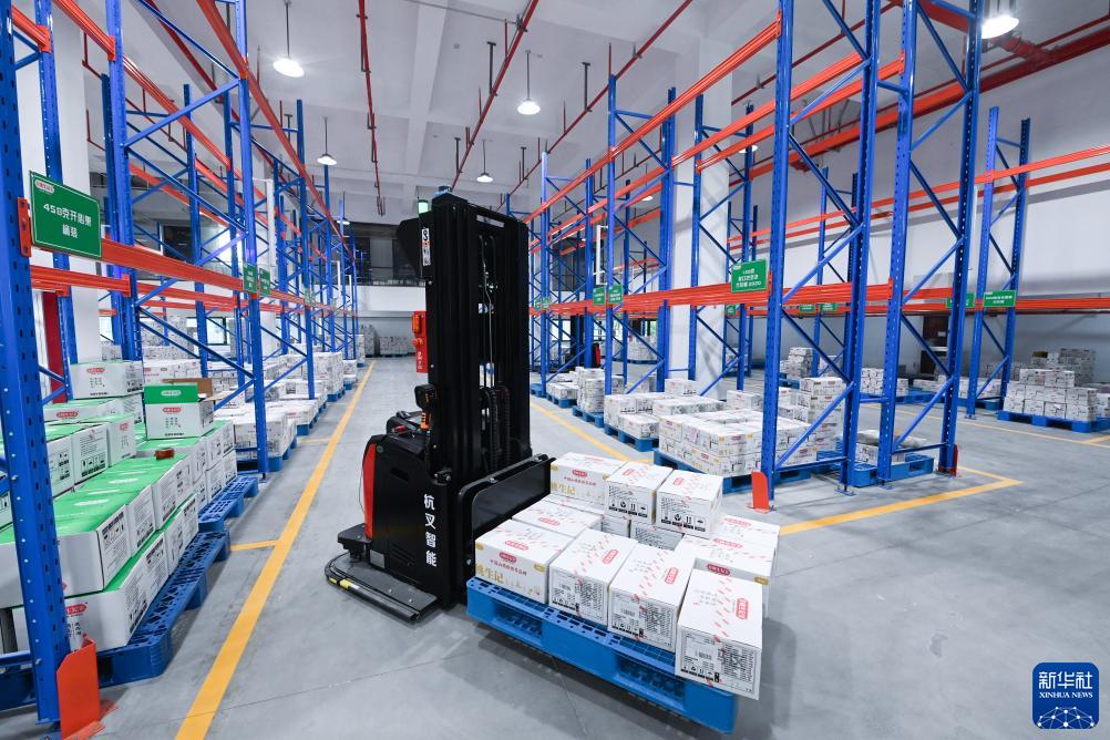 8月3日,全自动智能叉车在杭州市临安区龙岗镇一家坚果企业的数字化车间仓库内码放货物。