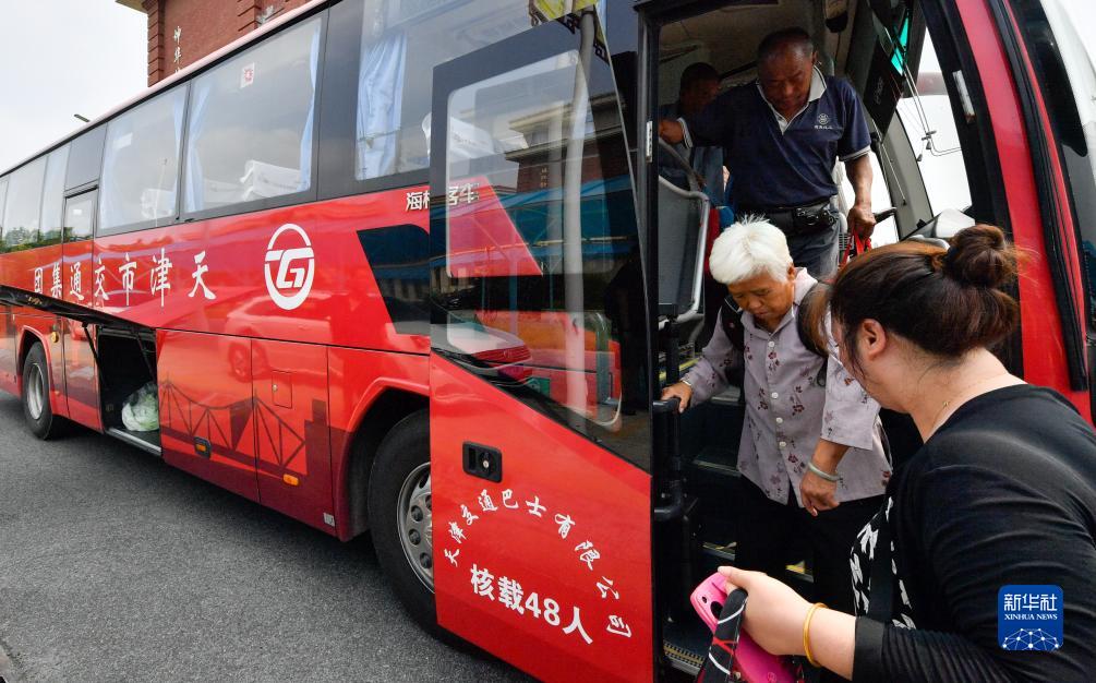 8月3日,大巴车运送转移群众至天津市静海区第六中学临时安置点。
